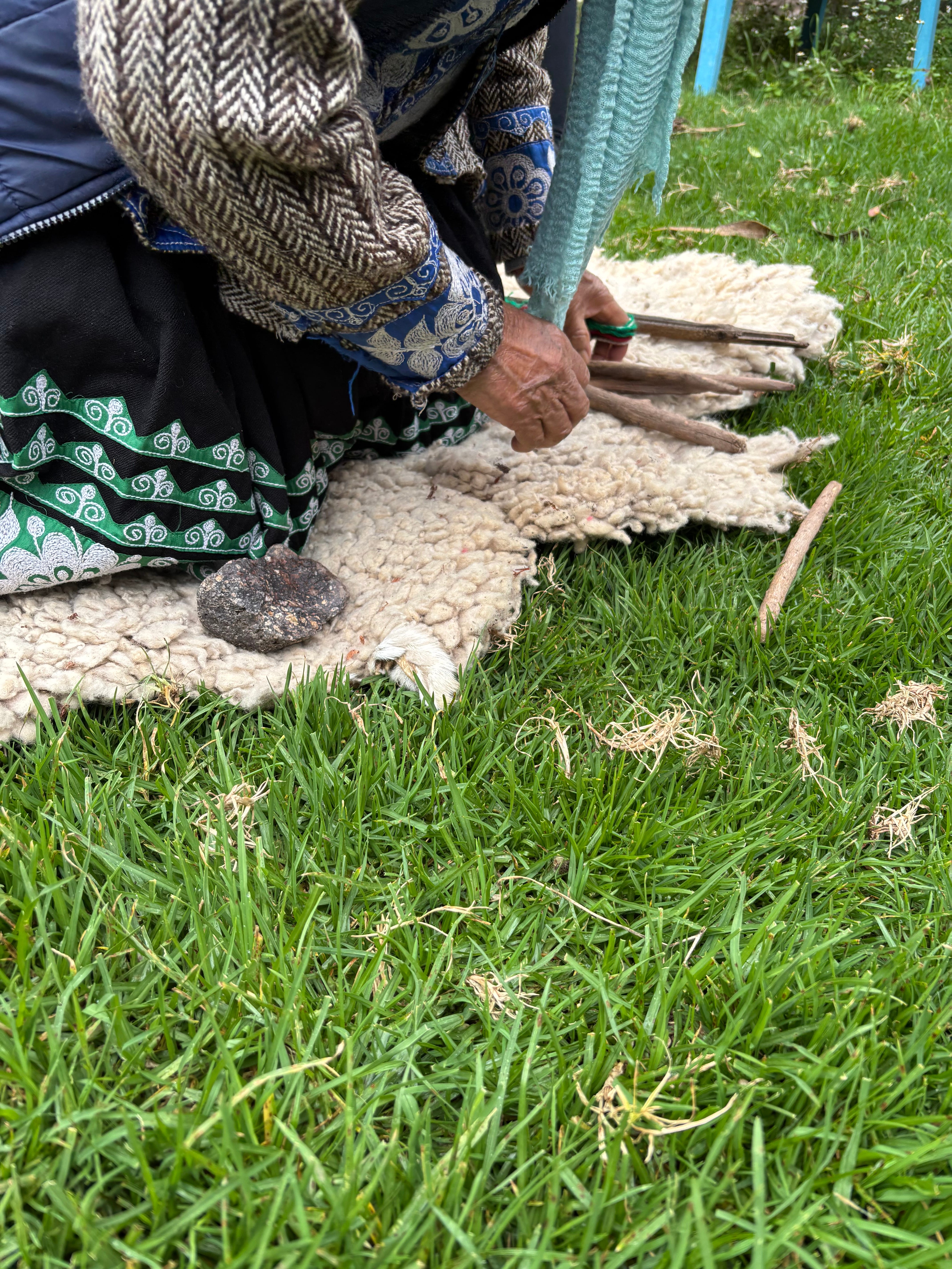 El lugar que nos recibió fue Apulaya, un proyecto familiar que entrelaza arte, cosmovisión andina y preservación cultural. Allí, Apolonia Coronel, nuestra maestra (y tejedora de toda la vida), nos enseñó la técnica con una paciencia silenciosa y firme. Su hijo Valerio, musicólogo y guardián de saberes, nos abrió las puertas de la filosofía andina, compartiendo teorías, sonidos de quena y archivo documental. Y Emérita, su compañera, nos alimentó el cuerpo y el espíritu con sus risas y energía expansiva.